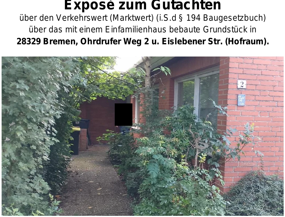Zwangsversteigerung: Einfamilienhaus, Garage in Ohrdrufer Weg 2, 28329 Bremen, (Gartenstadt Vahr) mit einem Verkehrswert von 220.000 €. Versteigerungstermin am 06.05.2026 am Amtsgericht Amtsgericht Bremen, 141 m² Wohnfläche, 361 m² Grundstück. Inklusive KI-gestützter Gutachtenanalyse mit Investitions-Score und Mängelbewertung.