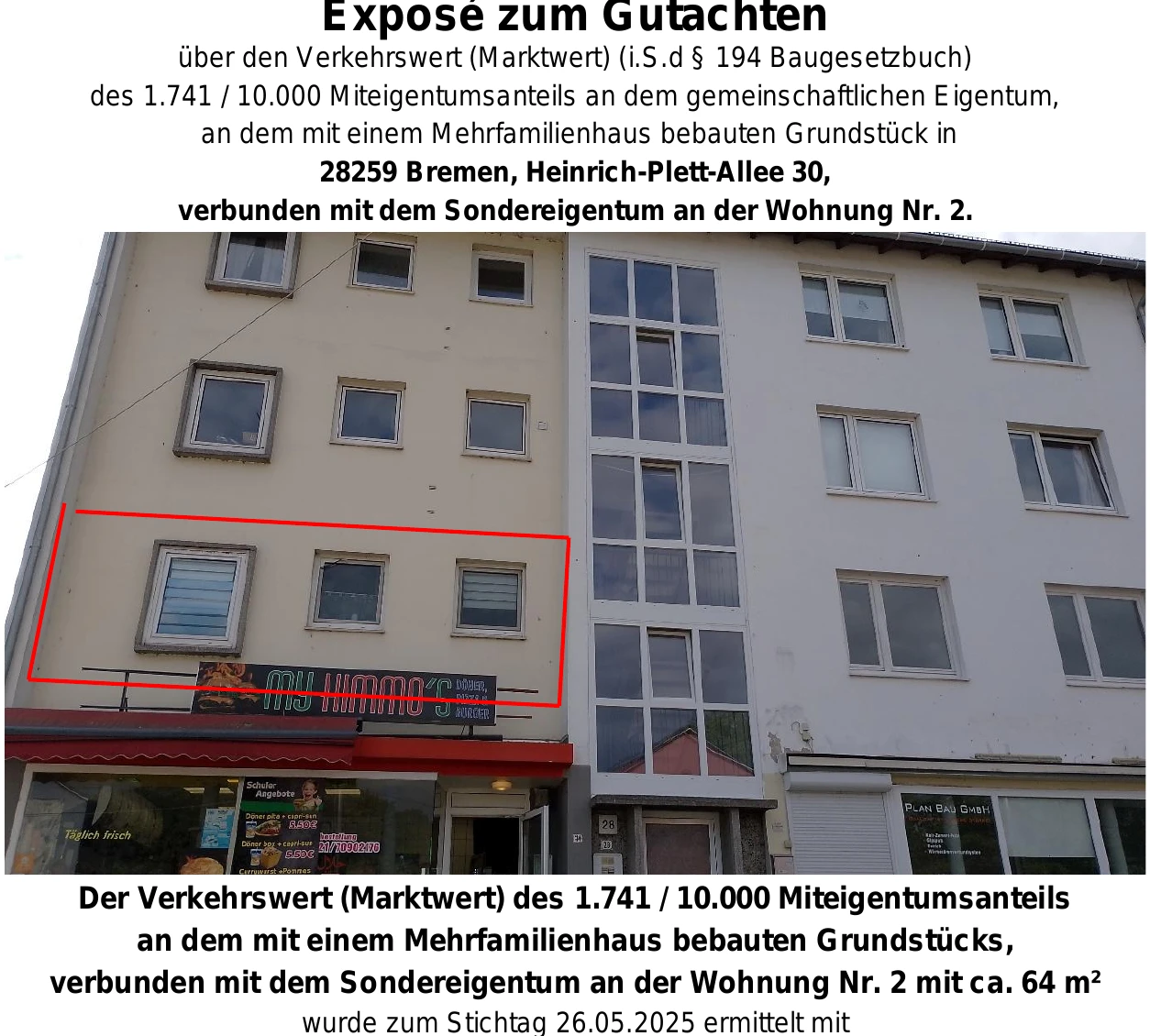 Zwangsversteigerung: Eigentumswohnung (3 bis 4 Zimmer) in Heinrich-Plett-Allee 30, 28259 Bremen, (Sodenmatt) mit einem Verkehrswert von 107.000 €. Versteigerungstermin am 15.04.2026 am Amtsgericht Amtsgericht Bremen, 64 m² Wohnfläche, 656 m² Grundstück. Inklusive KI-gestützter Gutachtenanalyse mit Investitions-Score und Mängelbewertung.