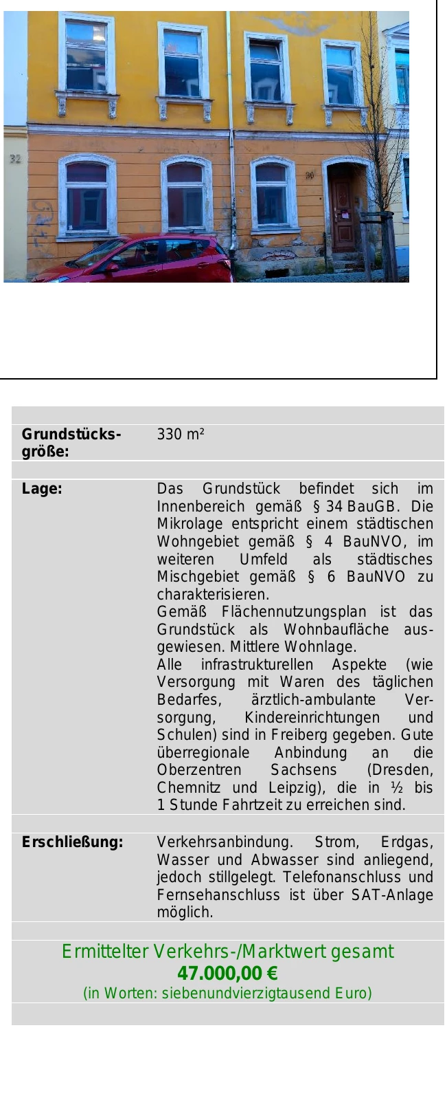 Zwangsversteigerung: Grundstück in Humboldtstraße 30, 09599 Freiberg mit einem Verkehrswert von 47.000 €. Versteigerungstermin am 09.03.2026 am Amtsgericht Amtsgericht Chemnitz, 216 m² Wohnfläche, 330 m² Grundstück. Inklusive KI-gestützter Gutachtenanalyse mit Investitions-Score und Mängelbewertung.