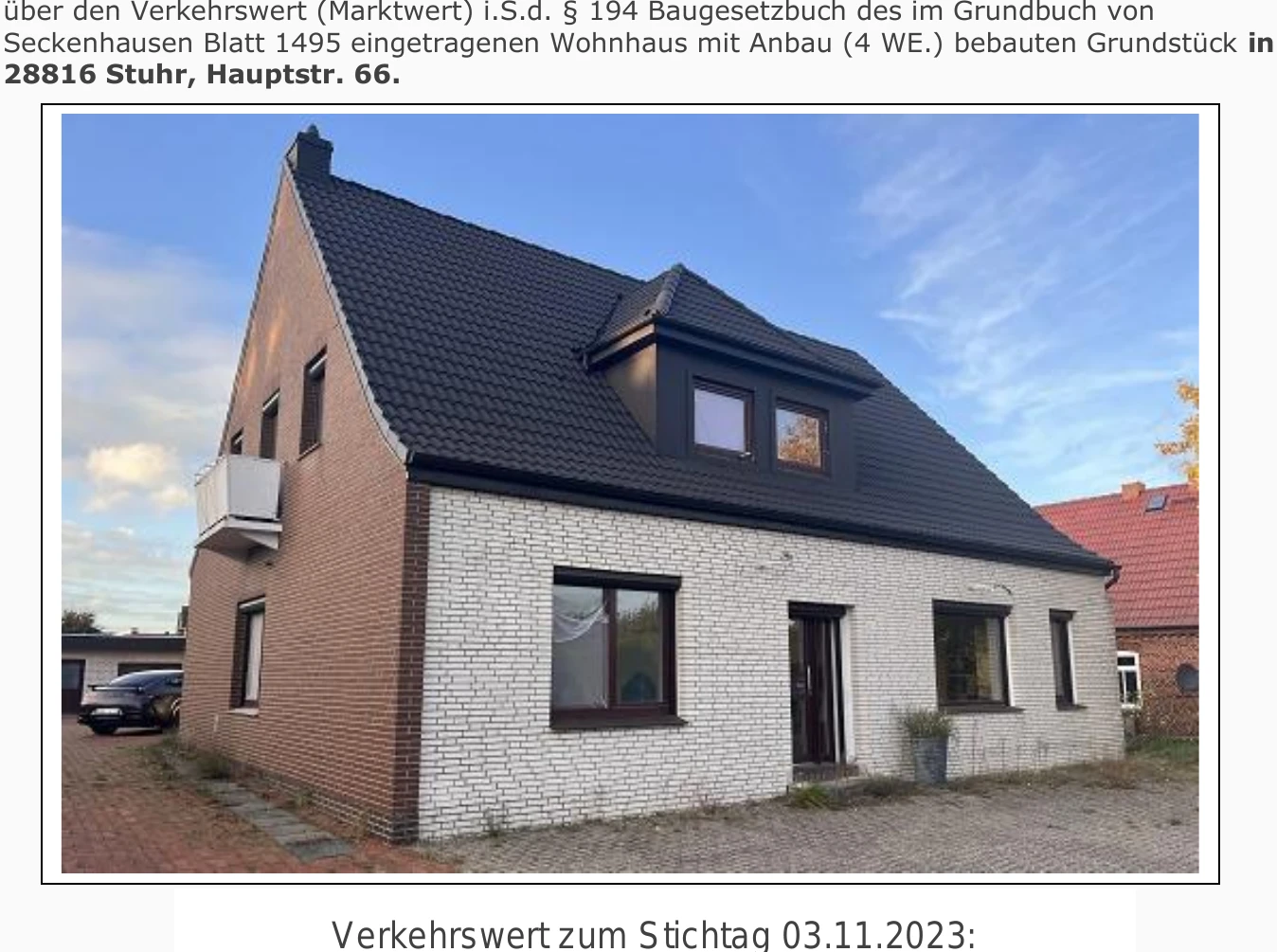 Zwangsversteigerung: Mehrfamilienhaus in Hauptstraße 66, 28816 Stuhr mit einem Verkehrswert von 485.000 €. Versteigerungstermin am 19.06.2026 am Amtsgericht Amtsgericht Syke, 398 m² Wohnfläche, 760 m² Grundstück. Inklusive KI-gestützter Gutachtenanalyse mit Investitions-Score und Mängelbewertung.