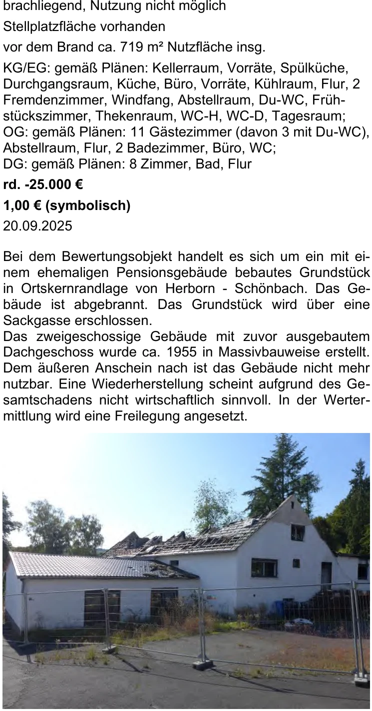 Zwangsversteigerung: Einfamilienhaus, Sonstiges in Im Weyertchen 2, 35745 Herborn, (Schönbach) mit einem Verkehrswert von 1 €. Versteigerungstermin am 25.06.2026 am Amtsgericht Amtsgericht Dillenburg, 1.868 m² Grundstück. Inklusive KI-gestützter Gutachtenanalyse mit Investitions-Score und Mängelbewertung.