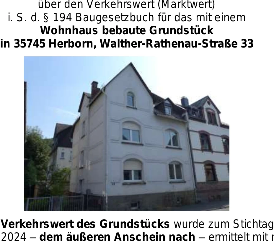 Zwangsversteigerung: Doppelhaushälfte, Sonstiges in Walther-Rathenau-Straße 33, 35745 Herborn mit einem Verkehrswert von 218.000 €. Versteigerungstermin am 21.05.2026 am Amtsgericht Amtsgericht Dillenburg Zweigstelle Herborn, 191 m² Wohnfläche, 185 m² Grundstück. Inklusive KI-gestützter Gutachtenanalyse mit Investitions-Score und Mängelbewertung.