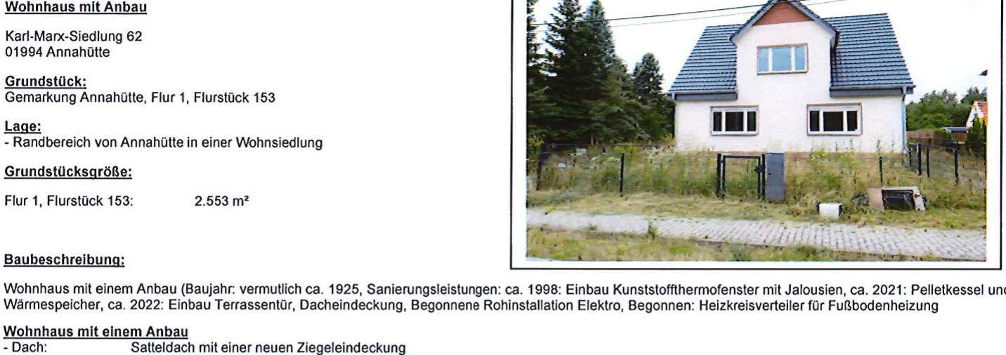 Zwangsversteigerung: Einfamilienhaus in Karl-Marx-Siedlung 62, 01994 Schipkau, (Annahütte) mit einem Verkehrswert von 80.000 €. Versteigerungstermin am 27.05.2026 am Amtsgericht Amtsgericht Senftenberg, 2.553 m² Grundstück. Inklusive KI-gestützter Gutachtenanalyse mit Investitions-Score und Mängelbewertung.