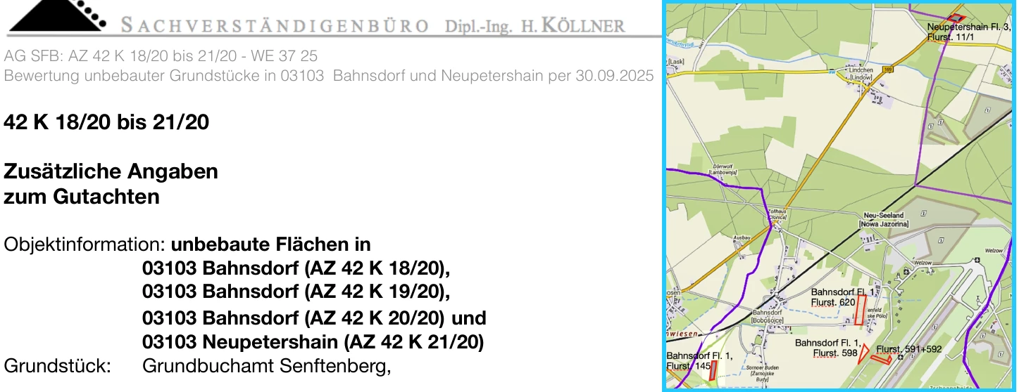 Zwangsversteigerung: land- und forstwirtschaftlich genutztes Grundstück in 03103 Neupetershain mit einem Verkehrswert von 6.200 €. Versteigerungstermin am 05.11.2026 am Amtsgericht Amtsgericht Senftenberg, 64.775 m² Grundstück. Inklusive KI-gestützter Gutachtenanalyse mit Investitions-Score und Mängelbewertung.