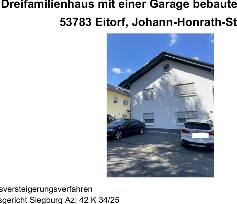 Zwangsversteigerung: Zweifamilienhaus in Johann-Honrath-Straße 13, 53783 Eitorf, (Harmonie) mit einem Verkehrswert von 615.000 €. Versteigerungstermin am 05.05.2026 am Amtsgericht Amtsgericht Siegburg, 275 m² Wohnfläche, 621 m² Grundstück. Inklusive KI-gestützter Gutachtenanalyse mit Investitions-Score und Mängelbewertung.