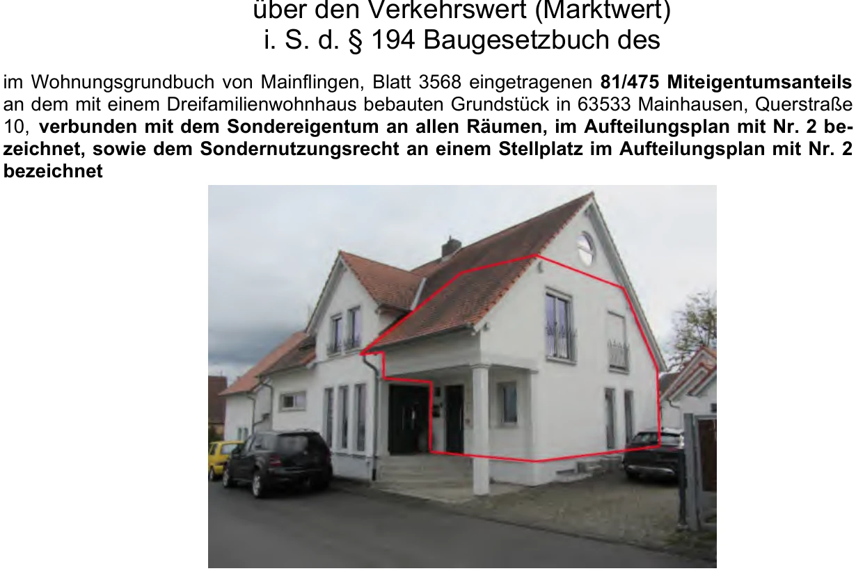 Zwangsversteigerung: Eigentumswohnung (1 bis 2 Zimmer) in Querstraße 10, 63533 Mainhausen, (Mainflingen) mit einem Verkehrswert von 213.000 €. Versteigerungstermin am 10.04.2026 am Amtsgericht Amtsgericht Seligenstadt, 63 m² Wohnfläche, 678 m² Grundstück. Inklusive KI-gestützter Gutachtenanalyse mit Investitions-Score und Mängelbewertung.