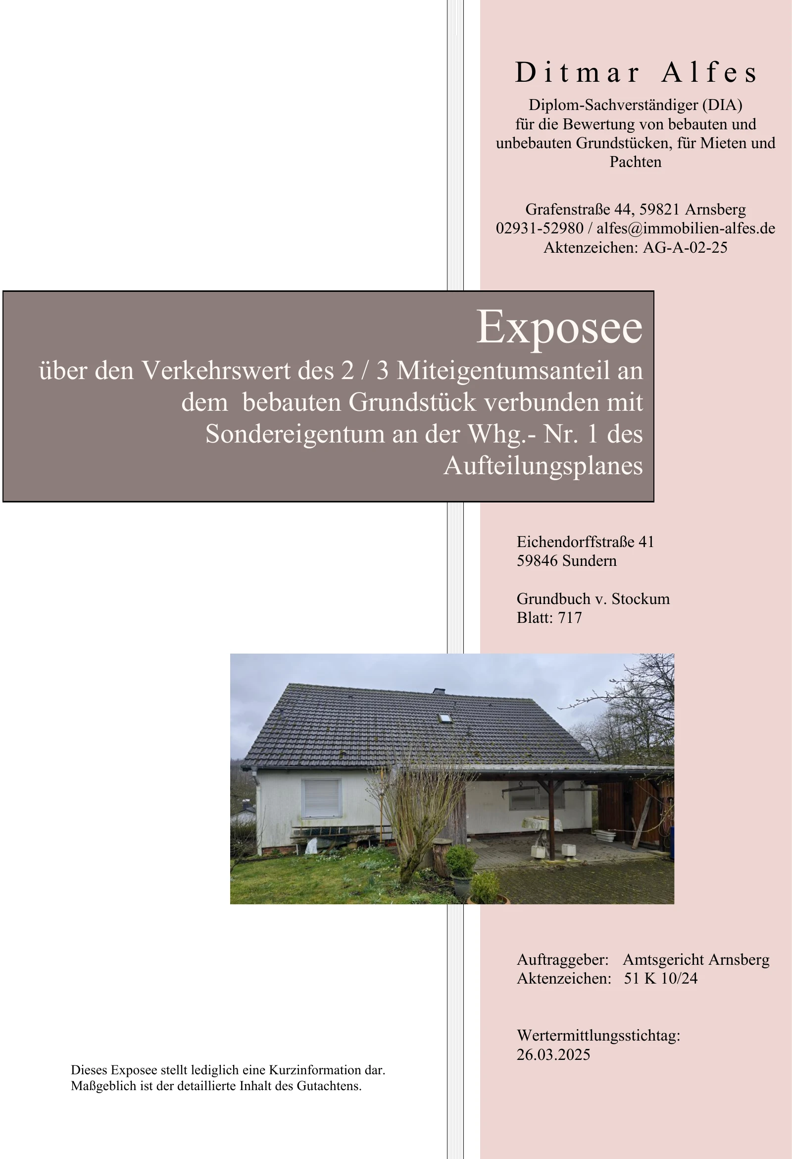 Zwangsversteigerung: Garage, Eigentumswohnung (ab 5 Zimmer) in Eichendorffstraße 41, 59846 Sundern, (Stockum) mit einem Verkehrswert von 135.000 €. Versteigerungstermin am 21.04.2026 am Amtsgericht Amtsgericht Arnsberg, 155 m² Wohnfläche, 786 m² Grundstück. Inklusive KI-gestützter Gutachtenanalyse mit Investitions-Score und Mängelbewertung.