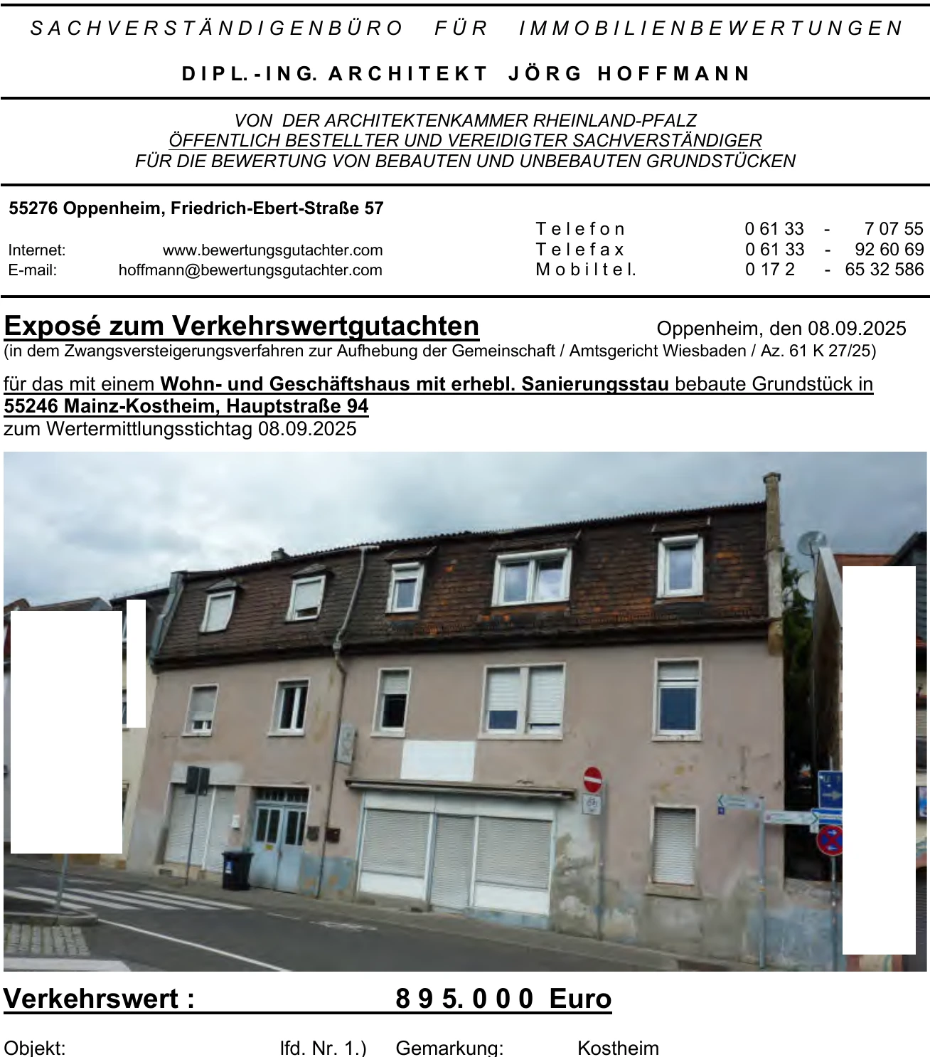 Zwangsversteigerung: Wohn- und Geschäftshaus in Hauptstraße 94, 55246 Kostheim mit einem Verkehrswert von 895.000 €. Versteigerungstermin am 25.03.2026 am Amtsgericht Amtsgericht Wiesbaden, 414 m² Wohnfläche, 331 m² Grundstück. Inklusive KI-gestützter Gutachtenanalyse mit Investitions-Score und Mängelbewertung.