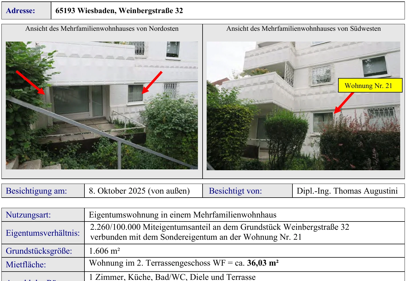 Zwangsversteigerung: Eigentumswohnung (1 bis 2 Zimmer) in Weinbergstraße 32, 65193 Wiesbaden mit einem Verkehrswert von 123.000 €. Versteigerungstermin am 26.03.2026 am Amtsgericht Amtsgericht Wiesbaden, 36 m² Wohnfläche, 1.606 m² Grundstück. Inklusive KI-gestützter Gutachtenanalyse mit Investitions-Score und Mängelbewertung.