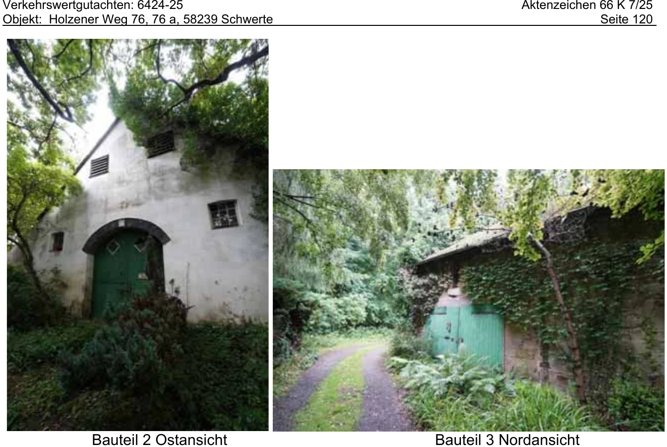 Zwangsversteigerung: land- und forstwirtschaftlich genutztes Grundstück, Zweifamilienhaus, landwirtschaftliche Nebengebäude in Holzener Weg 76, 76 a, 58239 Schwerte, (Rosen/Holzen) mit einem Verkehrswert von 391.000 €. Versteigerungstermin am 15.06.2026 am Amtsgericht Amtsgericht Schwerte, 205 m² Wohnfläche, 34.686 m² Grundstück. Inklusive KI-gestützter Gutachtenanalyse mit Investitions-Score und Mängelbewertung.