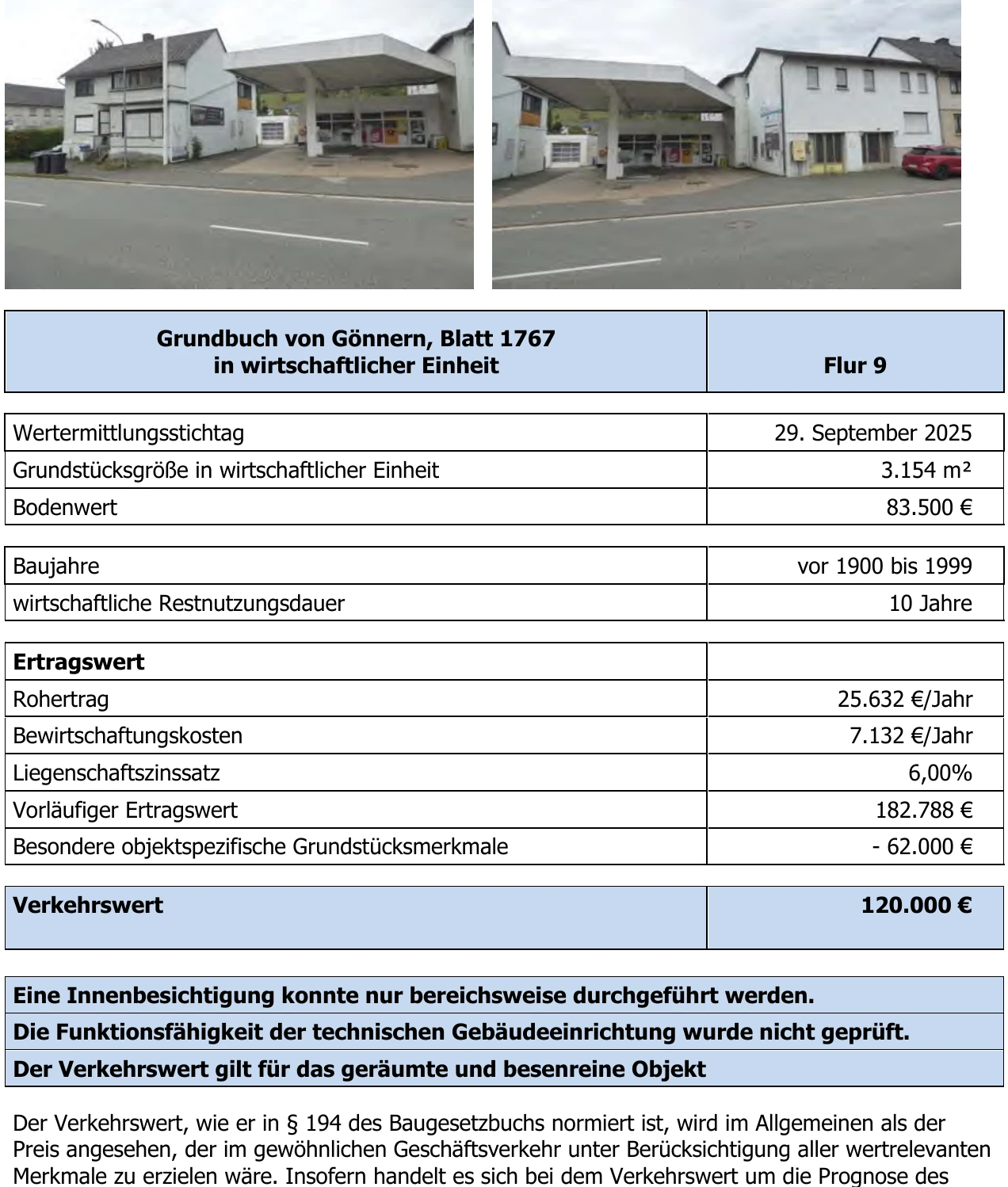 Zwangsversteigerung: Sonstiges, Gewerbeeinheit (z.B. Laden, Büro), gewerblich genutztes Grundstück, Betreiberimmobilien, Sonderimmobilien in Schelde-Lahn-Straße 219, 35716 Angelburg, (Gönnern) mit einem Verkehrswert von 120.000 €. Versteigerungstermin am 17.04.2026 am Amtsgericht Amtsgericht Biedenkopf, 199 m² Wohnfläche, 3.154 m² Grundstück. Inklusive KI-gestützter Gutachtenanalyse mit Investitions-Score und Mängelbewertung.