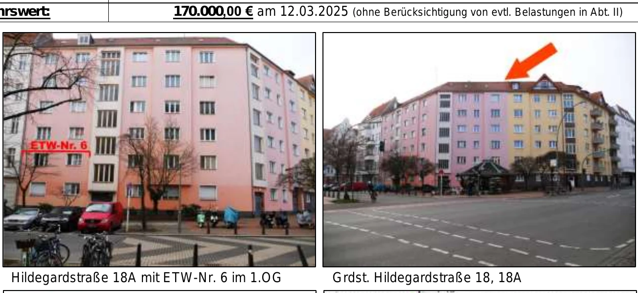 Zwangsversteigerung: Eigentumswohnung (1 bis 2 Zimmer) in Hildegardstraße 18, 18 A, 10715 Berlin mit einem Verkehrswert von 170.000 €. Versteigerungstermin am 13.04.2026 am Amtsgericht Amtsgericht Charlottenburg, 58 m² Wohnfläche, 679 m² Grundstück. Inklusive KI-gestützter Gutachtenanalyse mit Investitions-Score und Mängelbewertung.