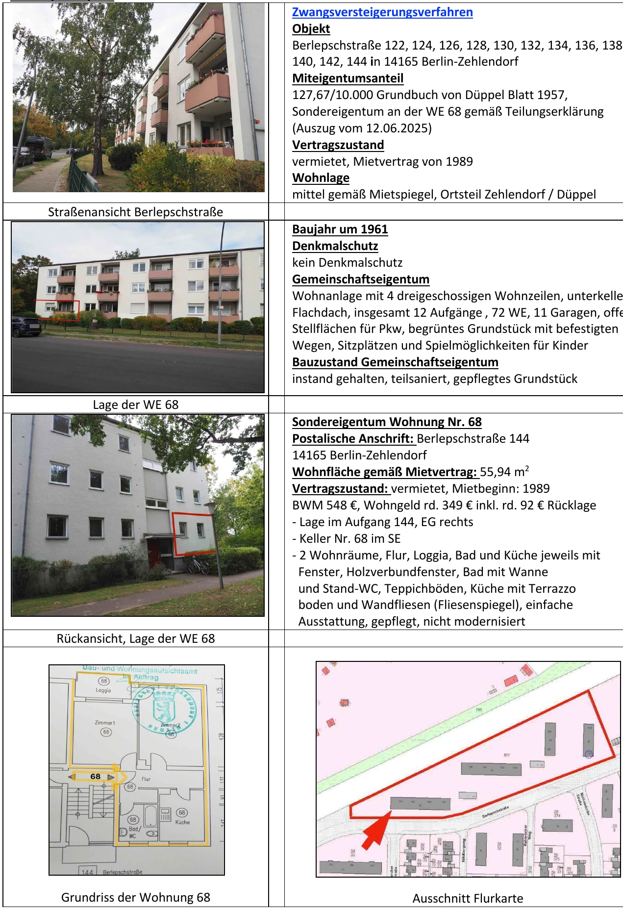 Zwangsversteigerung: Eigentumswohnung (1 bis 2 Zimmer) in Berlepschstraße 144, 14165 Berlin, (Düppel) mit einem Verkehrswert von 226.000 €. Versteigerungstermin am 03.03.2026 am Amtsgericht Amtsgericht Schöneberg, 56 m² Wohnfläche, 12.954 m² Grundstück. Inklusive KI-gestützter Gutachtenanalyse mit Investitions-Score und Mängelbewertung.