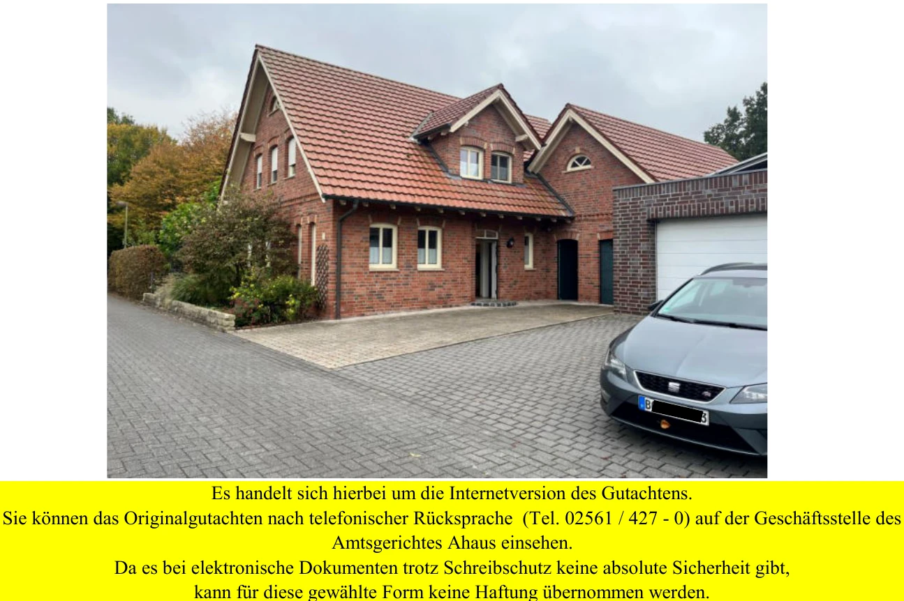Zwangsversteigerung: Garage, Einfamilienhaus in Nikolaus Weg 8, 48624 Schöppingen mit einem Verkehrswert von 512.000 €. Versteigerungstermin am 29.04.2026 am Amtsgericht Amtsgericht Ahaus, 177 m² Wohnfläche, 499 m² Grundstück. Inklusive KI-gestützter Gutachtenanalyse mit Investitions-Score und Mängelbewertung.
