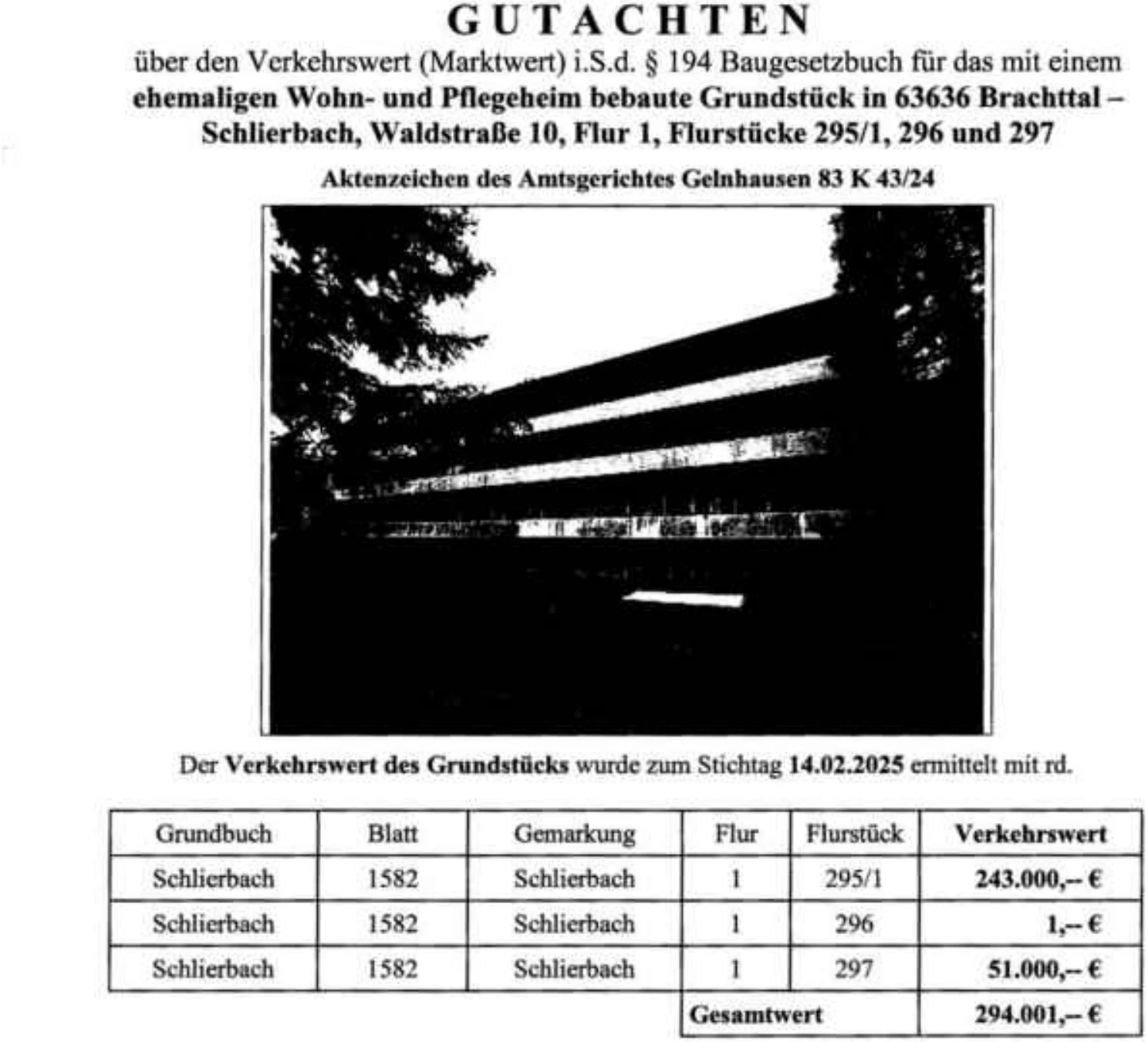 Zwangsversteigerung: Sonstiges in Vordere Bausacker / Waldstraße 10, 63633 Brachttal, (Schlierbach) mit einem Verkehrswert von 294.001 €. Versteigerungstermin am 23.04.2026 am Amtsgericht Amtsgericht Gelnhausen, 8.015 m² Grundstück. Inklusive KI-gestützter Gutachtenanalyse mit Investitions-Score und Mängelbewertung.