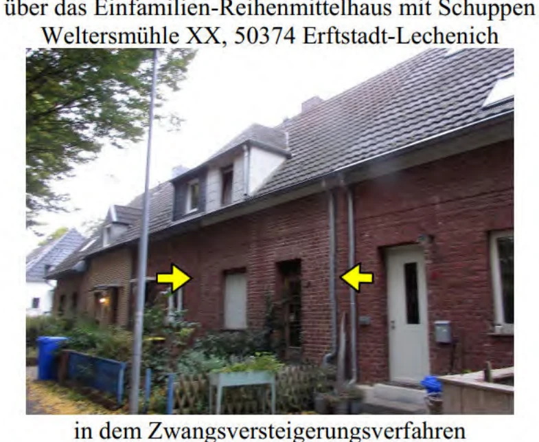 Zwangsversteigerung: Einfamilien-Reihenmittelhaus in Weltersmühle 29, 50374 Erftstadt, (Lechenich) mit einem Verkehrswert von 156.000 €. Versteigerungstermin am 07.07.2026 am Amtsgericht Amtsgericht Brühl, 76 m² Wohnfläche, 155 m² Grundstück. Inklusive KI-gestützter Gutachtenanalyse mit Investitions-Score und Mängelbewertung.