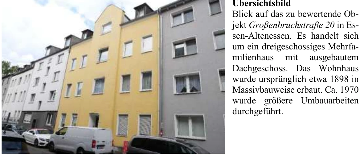 Zwangsversteigerung: Mehrfamilienhaus in Großenbruchstraße 20, 45326 Essen mit einem Verkehrswert von 243.000 €. Versteigerungstermin am 20.03.2026 am Amtsgericht Amtsgericht Essen, 437 m² Wohnfläche, 330 m² Grundstück. Inklusive KI-gestützter Gutachtenanalyse mit Investitions-Score und Mängelbewertung.