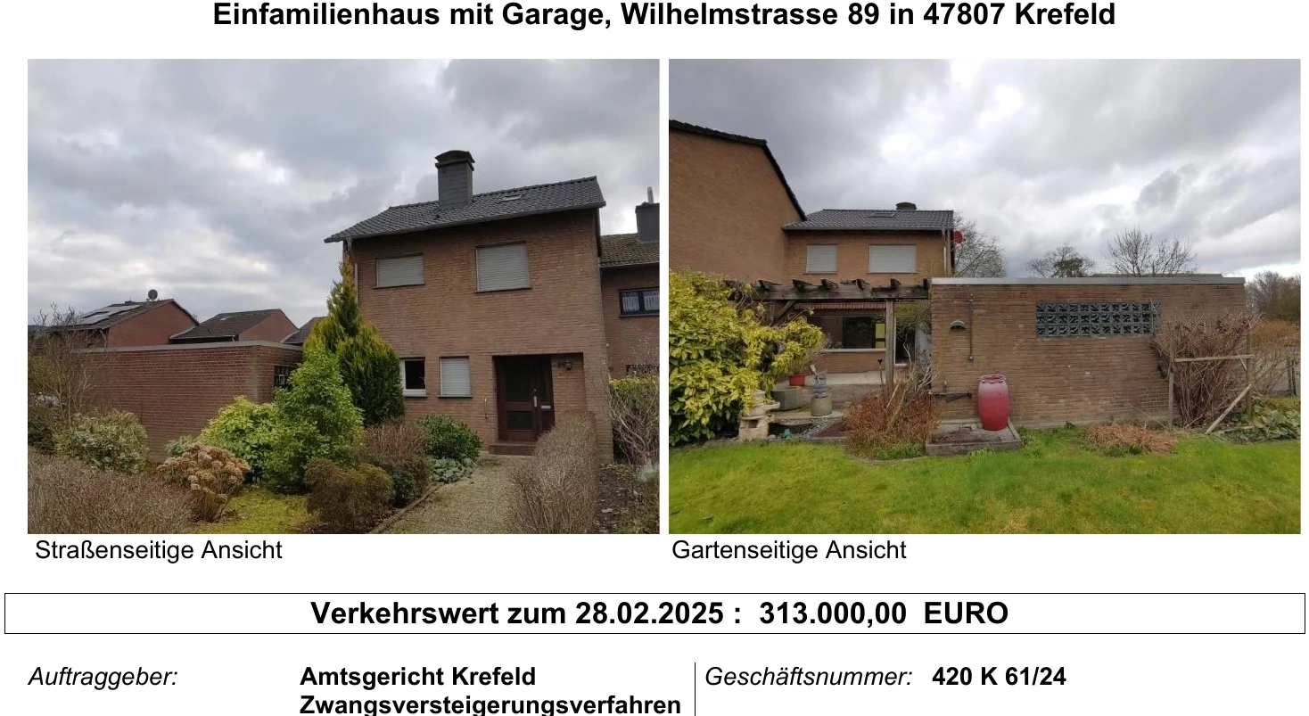 Zwangsversteigerung: Reihenendhaus mit zwei Garagen in Wilhelmstraße 89, 72764 Reutlingen mit einem Verkehrswert von 313.000 €. Versteigerungstermin am 21.05.2026 am Amtsgericht Amtsgericht Krefeld, 95 m² Wohnfläche, 560 m² Grundstück. Inklusive KI-gestützter Gutachtenanalyse mit Investitions-Score und Mängelbewertung.