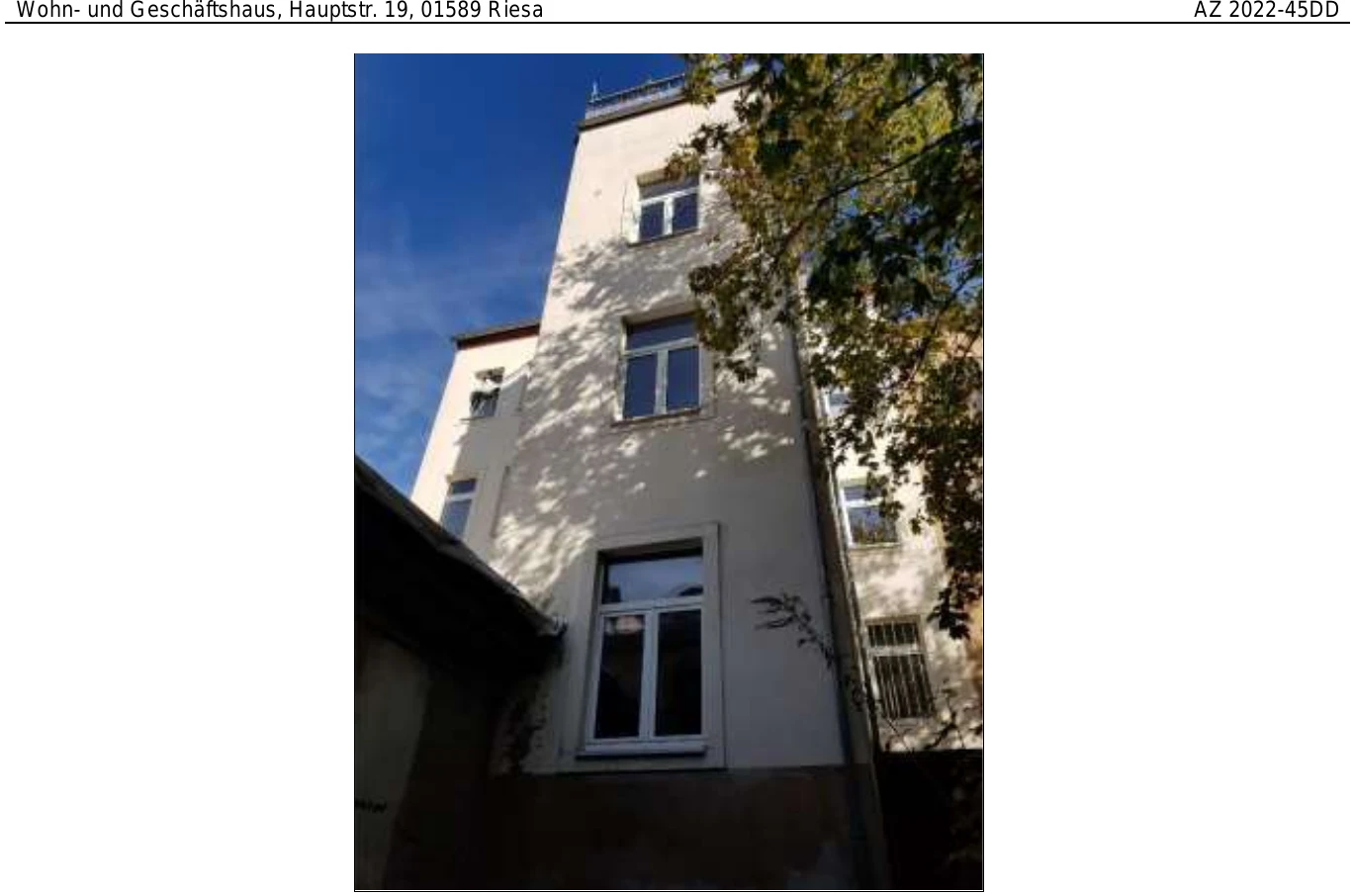 Zwangsversteigerung: Wohn-/Geschäftshaus in Hauptstraße 19, 01589 Riesa mit einem Verkehrswert von 340.000 €. Versteigerungstermin am 30.03.2026 am Amtsgericht Amtsgericht Dresden, 545 m² Wohnfläche, 330 m² Grundstück. Inklusive KI-gestützter Gutachtenanalyse mit Investitions-Score und Mängelbewertung.