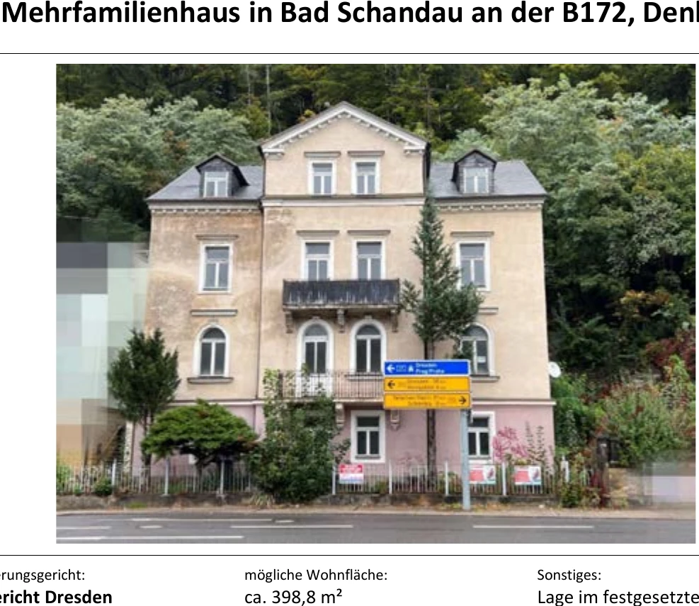 Zwangsversteigerung: Mehrfamilienhaus in Basteistraße 32, 01814 Bad Schandau mit einem Verkehrswert von 50.000 €. Versteigerungstermin am 16.03.2026 am Amtsgericht Amtsgericht Dresden, 399 m² Wohnfläche, 822 m² Grundstück. Inklusive KI-gestützter Gutachtenanalyse mit Investitions-Score und Mängelbewertung.