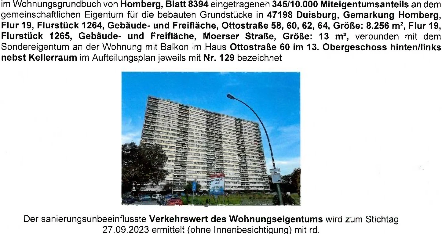 Zwangsversteigerung: Eigentumswohnung (3 bis 4 Zimmer) in Ottostraße 60, 47198 Duisburg, (Homberg-Hochheide) mit einem Verkehrswert von 21.900 €. Versteigerungstermin am 20.01.2027 am Amtsgericht Amtsgericht Duisburg, 84 m² Wohnfläche, 8.269 m² Grundstück. Inklusive KI-gestützter Gutachtenanalyse mit Investitions-Score und Mängelbewertung.