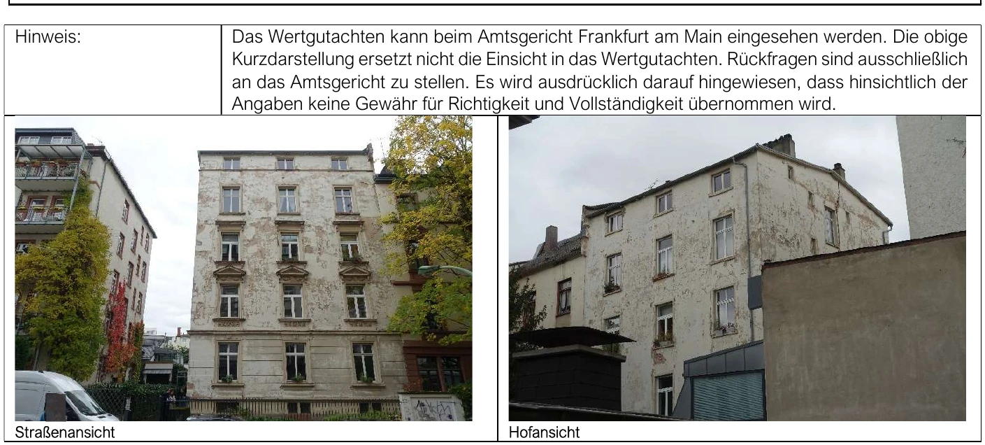 Zwangsversteigerung: Mehrfamilienhaus in Humboldtstraße 66, 60318 Frankfurt am Main mit einem Verkehrswert von 1.600.000 €. Versteigerungstermin am 07.05.2026 am Amtsgericht Amtsgericht Frankfurt am Main, 652 m² Wohnfläche, 362 m² Grundstück. Inklusive KI-gestützter Gutachtenanalyse mit Investitions-Score und Mängelbewertung.