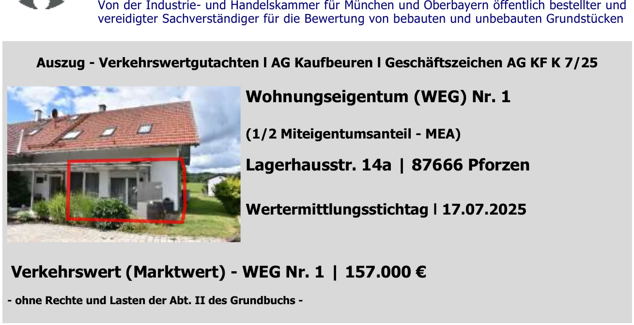 Zwangsversteigerung: Eigentumswohnung (1 bis 2 Zimmer) in Lagerhausstraße 14 a, 87666 Pforzen mit einem Verkehrswert von 157.000 €. Versteigerungstermin am 17.03.2026 am Amtsgericht Amtsgericht Kaufbeuren, 69 m² Wohnfläche, 810 m² Grundstück. Inklusive KI-gestützter Gutachtenanalyse mit Investitions-Score und Mängelbewertung.