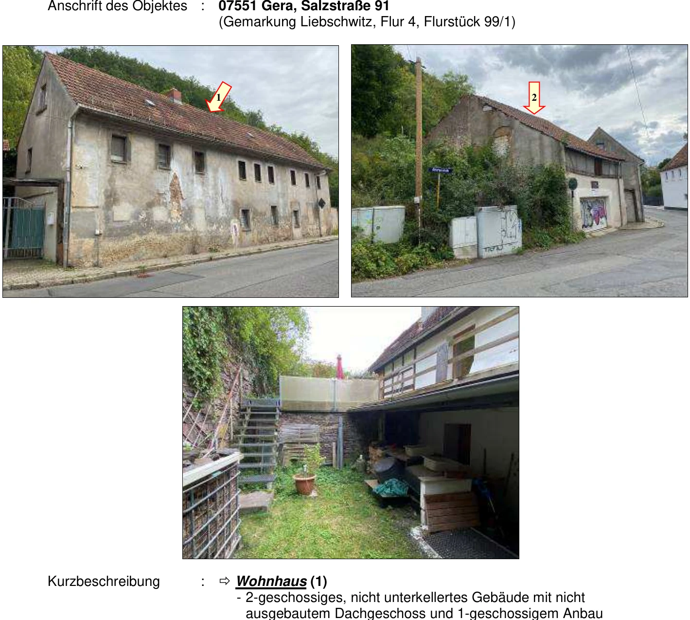 Zwangsversteigerung: Einfamilienhaus in Salzstraße 91, 07551 Gera mit einem Verkehrswert von 127.000 €. Versteigerungstermin am 02.06.2026 am Amtsgericht Amtsgericht Gera, 225 m² Wohnfläche, 550 m² Grundstück. Inklusive KI-gestützter Gutachtenanalyse mit Investitions-Score und Mängelbewertung.