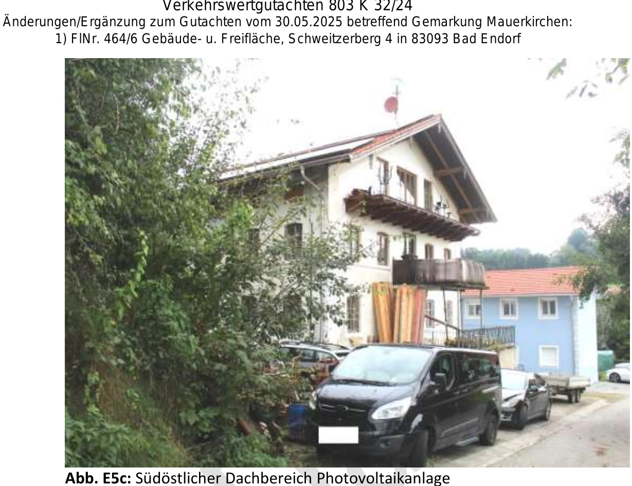 Zwangsversteigerung: Immobilie in Schweitzerberg 4, 83093 Bad Endorf mit einem Verkehrswert von 1.547.100 €. Versteigerungstermin am 20.05.2026 am Amtsgericht Amtsgericht Rosenheim, 385 m² Wohnfläche, 10.118 m² Grundstück. Inklusive KI-gestützter Gutachtenanalyse mit Investitions-Score und Mängelbewertung.