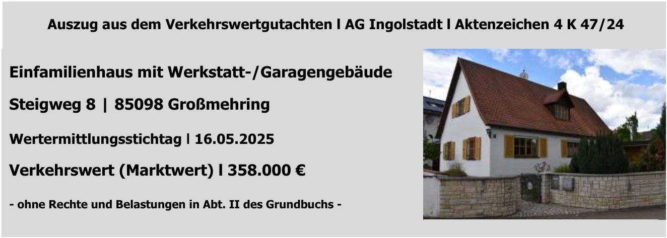 Zwangsversteigerung: Einfamilienhaus mit Werkstatt-/Garagengebäude in Steigweg 8, 85098 Großmehring mit einem Verkehrswert von 358.000 €. Versteigerungstermin am 30.04.2026 am Amtsgericht Amtsgericht Ingolstadt, 75 m² Wohnfläche, 485 m² Grundstück. Inklusive KI-gestützter Gutachtenanalyse mit Investitions-Score und Mängelbewertung.