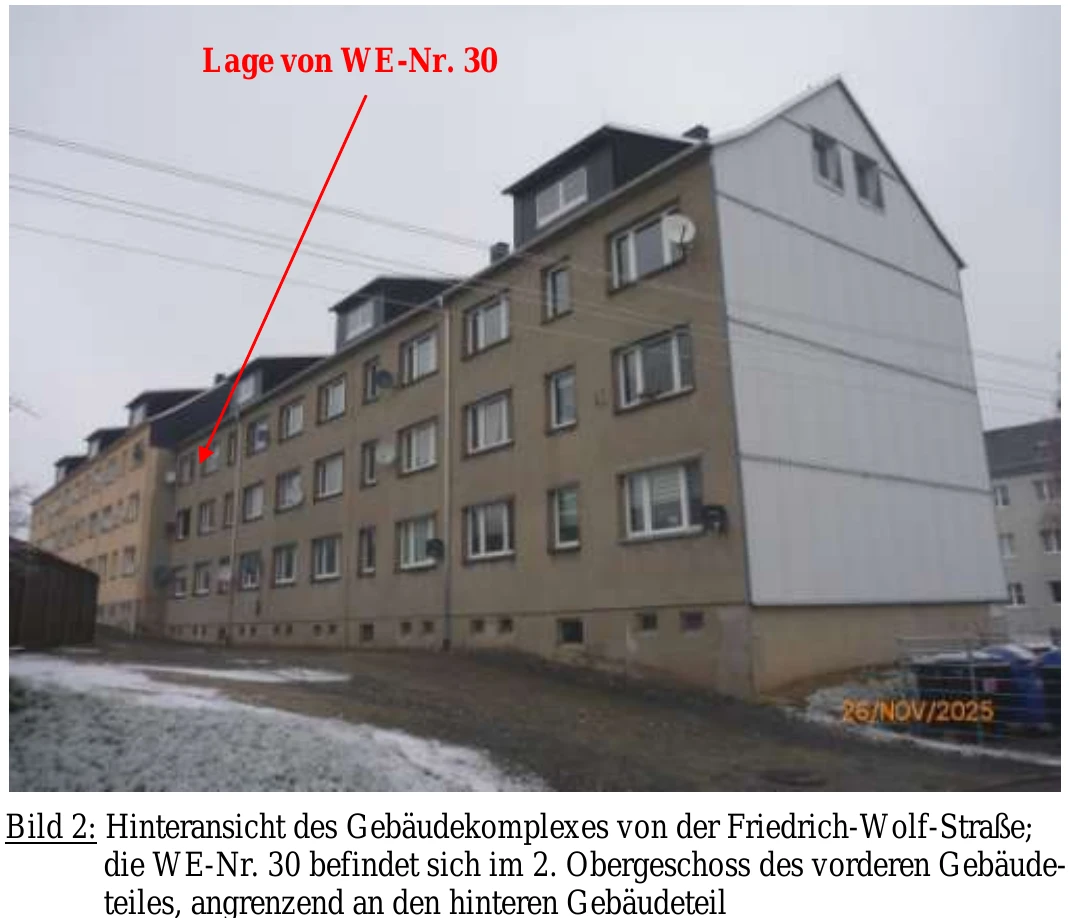 Zwangsversteigerung: Eigentumswohnung (1 bis 2 Zimmer) in Friedrich-Wolf-Straße 31, 07929 Saalburg-Ebersdorf mit einem Verkehrswert von 12.200 €. Versteigerungstermin am 14.07.2026 am Amtsgericht Amtsgericht Rudolstadt, 47 m² Wohnfläche, 2.919 m² Grundstück. Inklusive KI-gestützter Gutachtenanalyse mit Investitions-Score und Mängelbewertung.